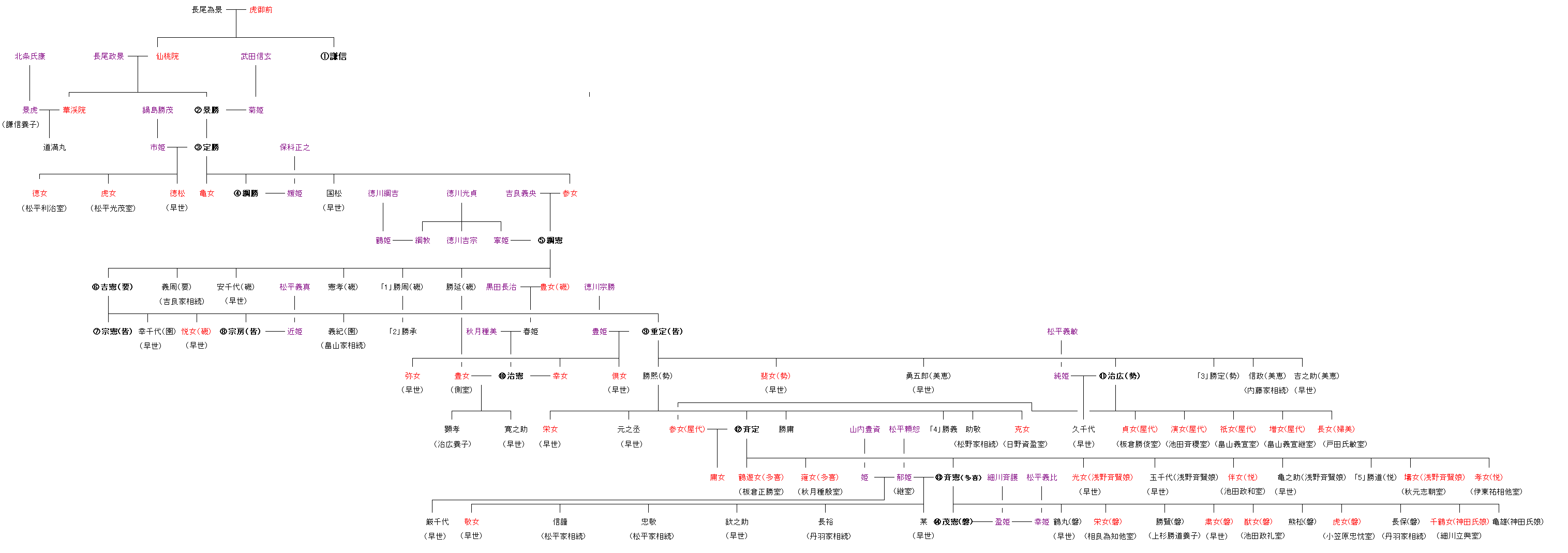 藩主は黒太字、男子は黒字、女子は赤字、外戚及び他家からの正室は紫字としました。